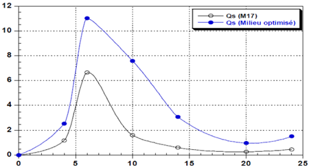 The evolution of sugar contents is opposed to the amount of biomass and lactic acid. S. thermophilus ferments the sugars in the culture medium by glycolysis pathway and produces lactic acid. The comparing of the two rates of the sugar consumption when using the optimized medium of culture and M17 culture medium for S. thermophilus growth showed the values of 11.02 and 6.66 g/gh respectively (Figure 5).