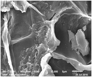 SEM micrographs of PGP and MB-loaded PGP shown respectively in Figure 1 indicate that surface of unadsorbed PGP is uneven, porous with large circular fissures and clefts resulting in an amorphous assembly. After adsorption, the irregularities and pores on the surface of PGP are occupied by the MB dye up to a considerable extent (Figure 1B).
