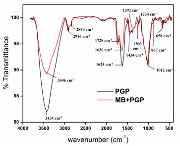 FTIR spectra of PGP and MB-loaded PGP are shown in Figure 2. The strong peak at 3434cm-1 represents O–H stretching vibration of alcohols (broadness of peak indicates H-bonding) whereas the peaks at 2916cm-1 and 2840cm-1 indicates the asymmetric and symmetric stretching vibration of aliphatic –CH3 or –CH2 groups. The peaks at 1728cm-1 and 1624cm-1 are attributed to C=O stretching vibration of the carbonyl group (may be aldehyde or ester) and symmetric stretching vibration of the C=C bond, respectively. The peaks in the range 1500-1300cm-1 (i.e. 1434cm-1 and 1392cm-1) specifies H–C–H bending vibration of the methyl group. The peak at 1234cm-1 signifies the C–O stretching vibration supporting the existence of carboxyl/alcohol/ether/ester functional groups in the adsorbent. The presence of aliphatic fluoro compounds is established by the peak at 1012cm-1 in the FTIR spectrum of PGP. The peaks in the ranges 915-850cm-1 (867cm-1) and 790-650cm-1 (658cm-1) might be due to the –C–H bending vibration of the alkene. On comparing the spectra of the two samples i.e. PGP and MB-loaded PGP, a slight shifting in the peaks from 3434cm-1 to 3446cm-1, 1624cm-1 to 1636cm-1 and 1234cm-1 to 1260cm-1 along with the reduction of peak intensities was observed in MB-loaded PGP. This indicates the participation of the respective groups (alcoholic/carboxyl/ether/ester/alkene) in the adsorption of MB onto PGP. Being a small atomic size and high electronegativity the N atom present in MB dye have the potential to form the H bond with OH group present in PGP. The adsorption of MB on PGP may also occur presumably due to the formation of H bond.