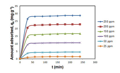 The variation of adsorption capacity (qe) with time for the adsorption of MB onto PGP is shown in Figure 3. It is apparent from the figure that the removal efficiency first rises rapidly in the early stage (0–30min), gradually slows down after 30min and lastly becomes constant after 180min. The rapid increase in adsorption in the initial stage is due to the accessibility of a large number of active sites on the peripheral surface of the adsorbent on which MB molecules get adsorbed through boundary layer adsorption.48 As the time is increased, the surface of the adsorbent gets saturated progressively with MB molecules. In the later stage, MB molecules get diffused into the pores of PGP which slows down the process of adsorption. Finally, when all the sites are occupied with dye molecules, the remaining dye molecules form aggregates at higher contact time.49 Thus, the equilibrium time for the MB-PGP system was judiciously taken to be 3h. It is also concluded from Figure 3 that the adsorption capacity increases with the increase in the concentration of MB from 25mg L-1 to 250mg L-1. A linear relationship between qe and Ce has been obtained with R2=0.9999 and represented by the following equation: