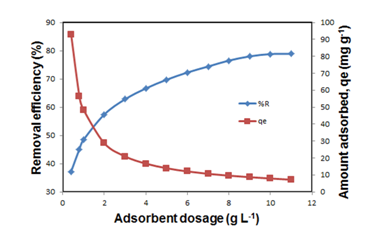 The effect of adsorbent dosage on the adsorption of MB was studied for different quantities of PGP (0.2–11g L-1). The results are presented in Figure 4. It can be clearly seen from the figure that the removal efficiency increases from 37.2% to 76.5% with the increase in PGP dosage from 0.1 to 8g L-1. Subsequently, there is no major change in the removal efficiency with a further increase in adsorbent dosage. The optimum adsorbent dosage for MB-PGP system was found to be 8g L-1. The increase in adsorption of MB with the increase in adsorbent dosage is due to the availability of a large number of active sites and large surface area.