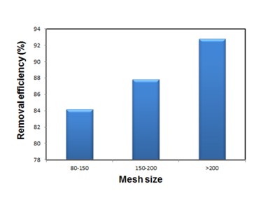 The effect of particle size of the adsorbent on MB adsorption is shown in Figure 5. It can be clearly seen from the figure that the removal efficiency increases from 84.1% to 92.7% in decreasing the particle size from 80–150 BSS to >200BSS. The reason for this behavior might be the increase in the surface area of the adsorbent and availability of a large number of active sites for adsorption. But, due to the handling difficulties accompanying smaller particle size, particles in the range of 80–150BSS were selected for the MB-PGP adsorption studies.