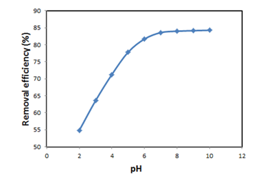 pH is an important factor which affects the process of adsorption. Figure 6 shows the effect of pH on the adsorption of MB by PGP at 100mg L-1 initial MB concentration. It can be seen from the figure that the adsorption of MB is 54.9% at pH value 2. The removal efficiency increased with the increase in the solution pH and reached up to 83.5% at pH=7. However, there is no further increase in the removal efficiency above the pH value of 7. At low pH values, the surface of the adsorbent becomes positively charge by the absorption of H+ ions leading to repulsion between cationic MB and positively charged adsorbent. Also, there is competition between H+ and MB molecules for the active sites on PGP. Similar observations were reported in the literature for MB-wheat shell50 and MB-yellow passion fruit peel51 adsorbate-adsorbent systems.