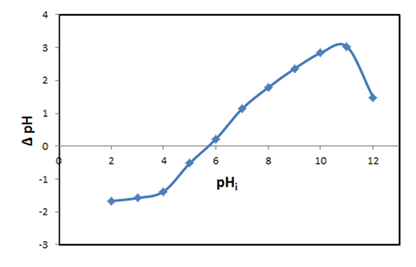 The effect of various parameters such as adsorbent dosage, contact time, particle size, pH and temperature were studied in a similar manner and were optimized to obtain the maximum removal of MB dye. Point of zero charge (pHpzc) of the adsorbent was determined using solid addition method.38 A series of 45mL solutions of 0.1N KNO3 were taken in 100mL conical flask and pH values were adjusted in the range of 2–12. The pH values of the solutions were adjusted using 0.1N HCl and 0.1N NaOH. After that the volume of the solution was made up to 50mL by adding the same solution. Pre-weighed samples of PGP (0.1g) were added to each flask and the solutions were agitated for 48h and final pHs (pHf) of the solutions were determined using a pH meter. The point at which the line in the ∆pH (i.e. pHf – pHi) vs pHi graph cross the x-axis gives the value of pHpzc.