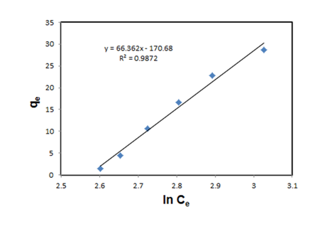 where, B= RT/b. B is the Temkin constant representing the heat of adsorption (J mol-1), KT is the equilibrium binding constant (L g-1), b is Temkin isotherm constant, R is gas constant (8.314J K-1 mol-1) and T is temperature (K). The values of B and KT can be calculated from the slope and intercept of qe versus ln Ce plot.