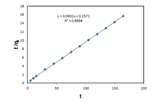 By comparing the R2 values for the various models, it is concluded that the best fit kinetic model for the adsorption of MB onto PGP is pseudo-second-order model (R2= 0.9998).