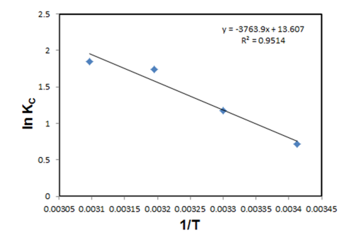 To explain the thermodynamic behavior of MB adsorption onto PGP adsorbent, 0.2g of PGP was added to 25mL 100mg/L of MB and agitated in a temperature-controlled water-bath shaker at 293, 303, 313 and 323K for 1h. The samples were filtered and the extent of adsorption was estimated spectrophotometrically. Enthalpy change (∆H°), entropy change (∆S°) and Gibbs free energy change (∆G°) were calculated using the following equations: