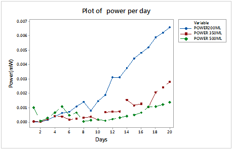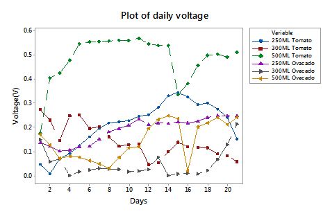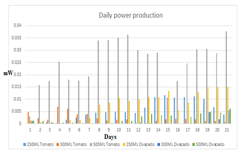The voltage and power obtained when tomato and avocado fruits wastes were used in MFC for 20 days are in appendix Table 1 while the plots are shown in Figure 2 & Figure 3 respectively. Highest voltage was obtained from 500ml rumen fluid in tomato fruits wastes for the entire study period. The voltage increased linearly for the first six days due to high digestion rate from high microbe concentration in the 500ml rumen fluid compared to the two lower concentrations. The lowest power was obtained from avocado incubator with 250ml rumen fluid.