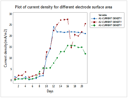 To investigate the effect of external resistance, a H–shaped double chamber was fabricated. Anodic chamber was loaded with 500g avocado and 250ml rumen fluid. In another set, 500g of blended tomatoes was used in place of avocado. 1kΩ, 2kΩ, and 45 kΩ resistors were attached to both terminals of the copper wire and current and voltage recorded.