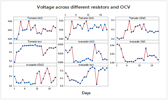 Table 3 Voltage across different resistors and OVC for tomato and avocado fruit wastes