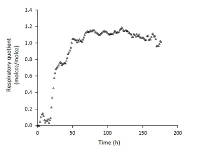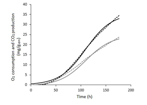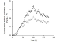 To determine the kinetic parameters associated to O2 consumption and CO2 production, their content in the exhaust gas at each PCB output was measured for 165 h. At 100 h of culture, the maximum O2 consumption and CO2 production rates were 0.23 and 0.35 mg/gidm h respectively (Figure 1).