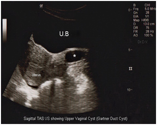 When located in the paravaginal space, giant Gartner's cysts can be misdiagnosed as pelvic masses or broad ligament cysts and result from ectopic communication with the ureter or cervix.13 There are some reports of Gartner’s duct cyst diagnosis during transabdominal and transrectal ultrasonographic examination.14 3 dimensional endovaginal and endoanal sonography can be diagnostic in doubtful cases.15 Ultrasonographic depiction of cystic structures within the uterine cervix are not uncommon, and these usually are considered to represent nabothian (retention) cysts, reported to range between 6 and 20 mm in diameter and located eccentric to the cervical canal. Gartner duct cysts may occur in the close vicinity to the uterine cervix or eccentric to the cervical canal. These may prove a diagnostic challenge with the transabdominal ultrasonographic approach, especially with regards to small, isolated cysts. With transvaginal ultrasonography, the transducer is placed in immediate proximity to the cyst and cervix, enabling accurate diagnosis and clearly differentiating between Gartner duct and nabothian cysts. Similarly, transrectal ultrasonography may be useful in the assessment of vaginal disease and diagnosis of Gartner duct cysts. Nevertheless, transvaginal ultrasonography appears a more direct imaging modality for vaginal and cervical lesions. The clinical importance in differentiating between Gartner duct cysts and cervical inclusion cysts is important as the former can be associated with ureteral, renal, and structural female genital tract anomalies, some of which may require surgical treatment. Enhanced ultrasonographic imaging and clarity of a Gartner duct cyst can be obtained using the transvaginal USG when compared to the transabdominal approach.16 Below the levator plate, localizing is best done by magnetic resonance imaging. Recurrences of giant cysts tend to be multiloculated when they are best managed by perioriodic surveillance, schlerotherapy and marsupialization into the peritoneal cavity.