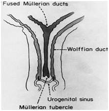 In a female fetus the mesonephric (Wolffian) ducts begin to develop at 20-30 days of gestation. The Müllerian ducts develop from the paramesonephric ducts, growing caudally on each side. By the 35th day after fertilization the lower part of the ducts change direction and grow towards the midline, where they meet and fuse with each other and then grow caudally once again. By the 65th day they complete fusion and their medial walls gradually disappear to form a single hollow tube (Figure 4). The mesonephric (Wolffian) ducts degenerate and remain as a vestigial system in females.3 Sometimes, the remnants secrete fluid and cause dilation of surrounding cells, becoming a Gartner's duct cyst, most often during and late adolescence. Classically, the cysts are solitary, unilateral, less than 2 cm in diameter, and are located in the submucosa of the anterolateral vaginal wall of the proximal third of the vagina.4