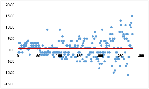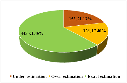 Seven hundred and twenty four (724) children were enrolled in this study. There were 460 boys (63.5%) and 264 girls (36.5%). The mean measured weight was 20.10±8.62kg in comparison with an estimation predicted weight of 19.85±7.99kg (p<0, 0001) (Table 1). Formula based weight estimate was exact in 61.46% (Figure 1). Error range was from -11 to +15 kg from measured weight (Figure 2). The mean differences between measured weight and calculated weight was 3, 23±2, 82kg sur (n=724). It was up to 5, 72±3, 49kg in range 4 (10 to 15 years old children) (Table 2). We have observed that the error absolute value was proportional to age range with a significant correlation of age with estimation absolute value (r=0.581; p=0.001) (Figure 3).
