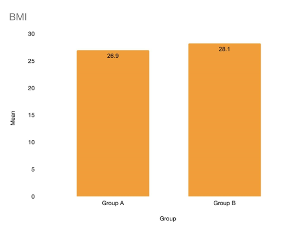 BMI: The comparison between BMI between groups were compared by independent t test with p value =0.223 which shows no statistical significant association between BMI and the groups.
