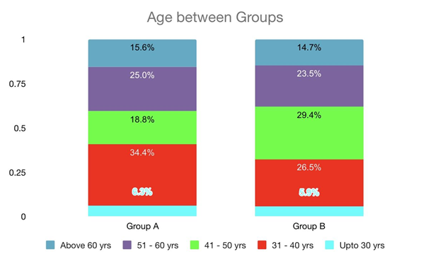 Age: Chi square test was used to compare age between both the groups, the difference between the age groups of both the study groups was not statistically significant (P value= 0.888).