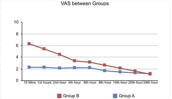 VAS at different time intervals: The VAS Score in Group A was less as compared to Group B. The difference was statistically significant (p<0.05) using Mann- Whitney U test at 15min, 1h, 2h, 4h, 6h, 8h (Figures) (Tables 1-7).