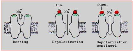 Really, regarding the mechanism of action of these drugs (Figures 1&2), this classification and nomenclature is being to some extent incorrect. Regarding the nondepolarizing neuromuscular blocking drugs there will be a certain way that the drug is blocking ionic channel of nicotinic receptor and by closing the receptor [blocked] no ion exchange will occur and no action potential will initiated and progressed, leading the muscle to be relaxed. However, when dealing with depolarizing drugs, their action on neuromuscular nicotinic receptor is differs completely, as these drugs seems to depolarize the receptor make it opened like the ligand acetylcholine, and ion exchange will occur but as action of depolarizing drugs is much longer than the ligand (minutes versus milliseconds) then a some type of no ion exchange will further occurs [equilibration or inactivation of voltage-gated sodium channels] the condition indeed some call it desensitization, when equilibration of ions occur then no further action potential will be initiated and the muscle therefore relax [not because of block but instead because of prolonged receptor state of opening]. In this case depolarizing drugs cannot consider as blocking drugs, rather than like if the acetylcholine prolonged its action. Therefore, I believe it is more logical and accurate to change the classification of neuromuscular blocking drugs as follow: