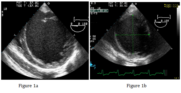 Figure 1a&1b Transgarstric Short Axis view of the left ventricle showing severely dilated left ventricle.