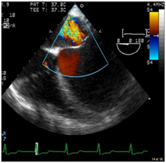 After emptying the stomach, the TEE probe was placed without difficulty. IABP was placed via the right femoral artery. Position of the IABP was confirmed with the TEE. Operation of the IABP was confirmed. A left femoral venous cordis was placed and central access was established. Preoperative TEE found an LV ejection fraction of approximately 5%, severely dilated LV (Figure 1a & Figure 1b), moderately dilated right ventricle, and moderate to severe right ventricular hypokinesis. Patient had a 4+ MR, with significant reversal of the systolic component of the right superior pulmonary venous profile (Figures 1c & Figure 1d).