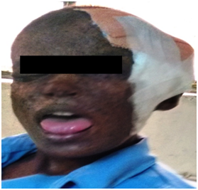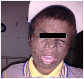 A 8 years old male, weighing 17 kg body weight with ASA grade I presented with a diagnosed case of Xeroderma pigmentosum associated with basal cell carcinoma situated over the central part of the scalp posted for a wide excision and a superficial skin grafting under general anaesthesia. He was having xeroderma pigmentosum since 5 years back; he presented with recurrent swelling at multiple sites mainly involving both upper and lower eye lids, tip of the nose and extended over the forehead (Figure 1). From the age of 2 years dermatological manifestation in the form of papulonodular ulcerative indurated lesion with pearly transparent rim lying over the central part of the scalp were present which gradually increasing in severity and size and measuring 8 cm x 5.0 cm2 (Figure 2). A multiple actinic keratosis poikiloderma was present in areas which are especially exposed to ultraviolet radiation. On exposure to sunlight child mainly complained of watering from both eyes with photophobia and occasionally associated with recurrent allergic conjunctivitis. General examinations were unremarkable. Another interesting fact in our report is that his elder sibling a ten years old child also suffered from the similar disease presented with recurrent dermatological lesion over the scalp which later on diagnosed as basal cell carcinoma (Figure 3). Her elder sibling has a past history of multiple surgeries for basal cell carcinoma of nose, forehead and lateral canthus of eye and he already received two cycles of chemotherapy regimen including inj. 5 FU 500 mg and inj. cisplatin 30 mg. The elder sibling was under regular follow up for his chemotherapy regimen. The pre-anaesthetic evaluation of the child was done in an environment with low light. On proper airway assessment: Upper lip bite test were done for temporomandibular mobility assessment it was grade II (Lower incisor can partially hide the mucosa of upper lip) and Inter incisor distance was more than 1.5 cm. Thyromental distance > 6 cm and mallampatti class III were present. No restricted neck movements were present. On physical examination following specific findings were present like bilateral corneal clouding, narrow opening of both external nares and a large tongue. A multiple irregular nodular actinic keratosis poikiloderma present throughout the body, especially in areas exposed to ultraviolet radiation. Systemic examinations were normal. All routine investigation was unremarkable. So based on above findings a difficult airway (including both mask ventilation and tracheal intubation) were anticipated in view of numerous skin nodules over face and large tongue. A written and informed consent were taken from his mother for emergency Tracheostomy in view of anticipated difficult airway apart from difficult airway cart were kept ready. For anxiolysis tab alprazolam 0.25mg and as antacid prophylaxis tab ranitidine 150 mg were advised a night before surgery. NPO orders were issued. As premedication, thirty minutes prior to procedure oral midazolam suspension (10mg) were given to keep the child quiet and cooperative. On arrival to the operation theatre all standard monitoring were attached in the form of ECG, NIBP, SPO2, ETCO2 and axillary skin temperature probe. On preoxygenation a proper child face mask fitting were not possible because of multiple skin nodules over the face and smaller external nare openings. So paediatric face masks were used over the child mouth for securing proper seal and adequate mask ventilation. Then the child was induced with sevoflurane on increasing concentration till child maintain spontaneous respiration, meanwhile venous access was established in right lower limb on multiple attempts as it was difficult to obtain venous access in both upper extremities due to skin changes. On obtaining intravenous access injection fentanyl 2µg/kg body weight were given. Then anaesthesia was maintained with dexmedetomidine (30 µg) infused over 10 min, and the child were under continuous monitoring as there was an increased risk for excessive sedation leading to airway compromise. After placing the child in a sniffing position, first we performed conventional laryngoscopy with Macintosh blade 2 and it was difficult to visualize the epiglottis. So Mac coy laryngoscope were used as an alternative for performing laryngoscopy on second attempt and posterior one third of vocal cord were visualised with difficulty but on applying BURP manueveur endotracheal intubation were performed using 6 mm ID cuffed endotracheal tube over a gum elastic bougie. Tracheal tube placement was confirmed by capnography and bilateral air entry on auscultation. As non depolarizing muscle relaxant atracurium was used as a dose of 0.5 mg/kg. Intraoperative period of surgery and anaesthesia were uneventful. On 5th postoperative day the child were discharged with further follow up for chemotherapy regimen.