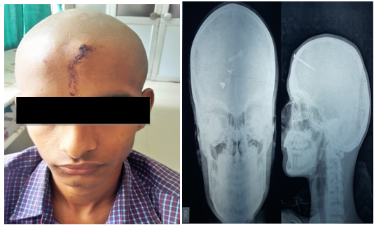 A 19 year old male patient presented in the emergency department of Gauhati Medical College and Hospital with a 2 day history of traumatic nail injury brain. Patient was referred to this institute for urgent neurosurgical intervension. The patient had a post traumatic loss of consciousness, now complaining of severe headache with frequent nausea vomiting and weakness of the right upper limb. Household repairs were going on in his when he accidentally slipped and fell head on a nail. He was immediately rushed to the nearby health facility, from where he was referred to Gauhati Medical College. Patient was examined by the emergency neurosurgery and neuroanaesthesia team.