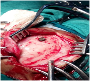 He had a Glasgow Coma Score of 13/15, no other external injuries were noted. A nail head entry wound was visible on his scalp with bloody discharge around it (Figure 1). His right upper limb power was 3/5 as per Medical Research Council grading with poor hand grip in comparison to the opposite side with no other focal neurological deficit. Routine blood investigations, coagulation profile were normal. Skull X-ray showed a vertically oriented radio-opaque nail penetrating through the frontal bone of skull and into the brain parenchyma (Figure 2). Computerized tomography scan revealed a 7cm long nail penetrated through the frontal bone and into the left frontal lobe of brain (Figure 3). It was evident that nail required immediate surgical removal. An informed consent was obtained from the patient for the operative procedure & general anaesthesia. Patient had received Tetanus Immunoglobulin 250 IU and Inj Tetanus Toxoid I.M in the emergency department.