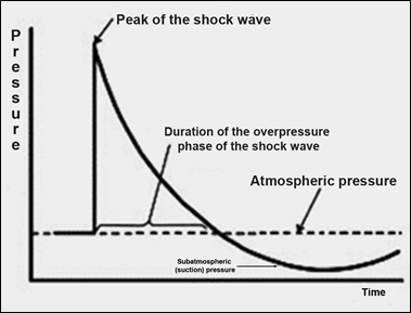 Figure 1 Shock wave diagram. Time-pressure relationship in an open environment (Friedlander curve): sudden, almost instantaneous and very brief increase in atmospheric pressure (overpressure peak), followed by a phase of subatmospheric (suction) pressure. Figure modified by the authors: Harrisson SE, Kirkman E, Mahoney P. Lessons learnt from explosive attacks. Journal of Royal Medical Corps 2007; 153 (4): 278-82.