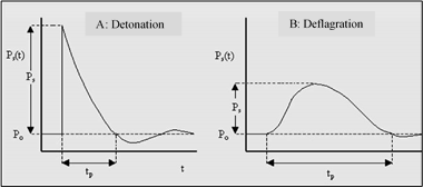 Figure 2 Evolution of the shock wave over time for detonating (A) and deflagrating (B) explosions. Po atmospheric pressure. Ps shock wave amplitude. Ps(t) shock wave peak. tp: duration of the positive phase of the shock wave. t, time. Source, modified from: TNO: Green book, Methods for the determination of possible damage to people and objects resulting from release of hazardous materials. CPR 16E. 1992.