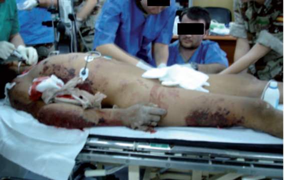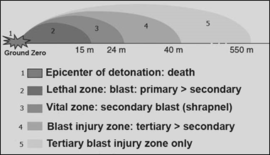 In mass casualty incidents involving a blast wave, 3 zones are identified26 a) epicenter of the blast (kill zone), most people are dead or fatally injured, b) secondary perimeter (critical casualty zone), there are more survivors, but most of them probably have multiple injuries (Figure 6), and c) periphery of the blast (injured walker zone), most victims have non-life threatening injuries and others have psychological trauma (anxiety, panic, etc.). This zonal distribution corresponds to the pattern of occurrence of blast wave injury types: a) primary injury zone (barotrauma damage), b) secondary injury zone (shrapnel injuries), and c) tertiary injury zone (acceleration-deceleration injuries).