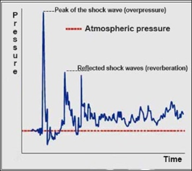 The SW profile of the detonating explosive is different from that of the deflagrating explosive (Figure 2: A and B). The former is sharper, so that the maximum (peak) value is reached suddenly. In the latter, the rate of increase of overpressure is much slower. Another significant difference is that the duration of the negative phase of detonators is longer than that of deflagrants. As the SW of the detonating explosion progresses and moves away from the origin of the explosion, it becomes softer and its profile ends up being similar to that of the deflagrating explosion. Another difference between the detonating and deflagrating waves is related to their audibility, so that only the former is audible. With conventional explosives the duration of overpressure phase usually lasts ≈5 ms and the underpressure phase ≈25 ms. In contrast in atomic explosions the estimated duration of hyperpressure is 1 min and suction 10-15 min.