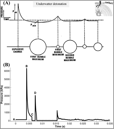 Figure 5 Example pressure-time curves for underwater blasts. (A) Idealized curve. (B) Example curve for an underwater blast with surface and bottom reflections. A: ambient pressure. B: peak positive overpressure. C: onset of pressure reduction from surface rarefaction wave. D: secondary peak from bottom reflection. Source, modified from: Lance RM, Capehart B, Kadro O, et al. Human Injury Criteria for Underwater Blasts. PLoS One. 2015;10(11):e0143485.