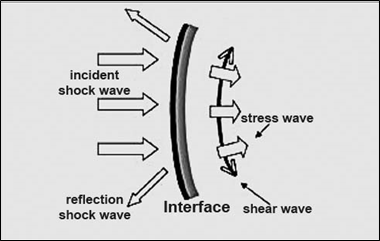 The four mechanisms in their physical phase have the following considerations: The oldest described is scaling or defragmentation or splintering or spallation. The SW on impact with the body and passing through tissues of different densities causes tissue disruption, as the magnitude of the total wave (direct and reflected) exceeds the tensile strength of the tissue, so the interface separating them breaks towards the less dense medium, resulting in crack formation, microfragmentation and spalling (splintering, flaking, slabbing) on the tissue surface. The damage is microscopic rather than visible lacerations.28 In addition, the hyperpressure component of the SW passing through the different layers of the body tissue generates pressure differences, resulting in "molecular" disruption. On the other hand the negative pressure component of the SW, i.e. a drop below the local (vapour) pressure, causes the formation of "microbubbles" from the dissolved gas, which travel to areas of higher pressure where they coalesce and explode (cavitation effect), further increasing tissue spalling. Cavitation and tissue spalling are common at the tissue/gas and fluid/gas interface respectively, causing severe microvascular damage and tissue defragmentation.29 On the other hand, they are different and sometimes non-concurrent phenomena.30 Typical examples are: water splash in underwater detonation or when throwing a stone into the water, joint cracking or cavitation, anti-tank combat weapons and deterioration of reinforced concrete ("crocodile skin" cracks, spalling and falling out). Spalling occurs when the pressure SW passes from a denser medium to a less dense medium. Typical effect of spalling on the intestine2 and lung13 are: from the intestinal wall into the gas-filled intestinal lumen causing wall hematoma and/or haemorrhage; from the pulmonary capillary into the air-filled alveolus causing alveolar haemorrhage, respectively.