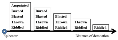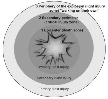 The severity of the injuries depends on the distance of the victim from the focus of the blast. Three zones are considered: epicentre (lethal zone) where the primary blast acts, secondary perimeter (critical zone) where the secondary and tertiary blast acts and the periphery of the explosion (minor injuries).