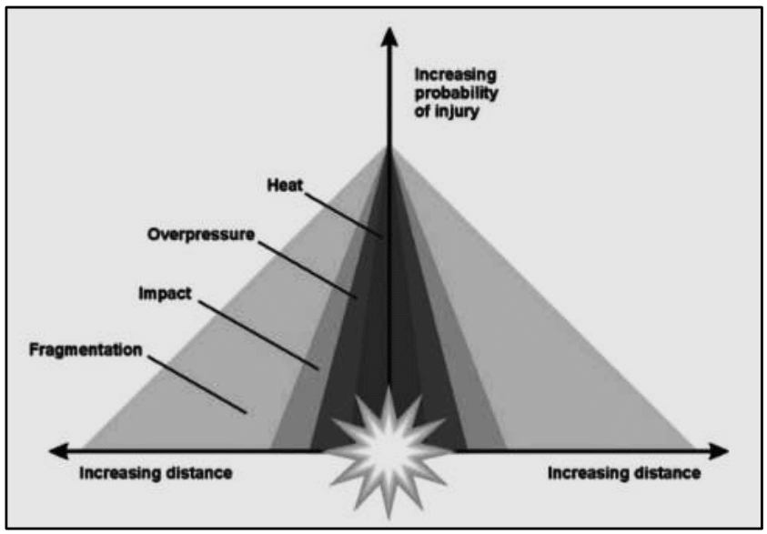 Figure 5 Probability of injury according to distance from the blast epicenter. Source, modified from: Emergency War Surgery: 5th edition United States Revision.