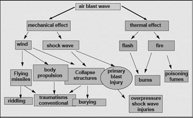 The harmful effect of chemical explosions on living beings and the destructive effect on nature are encompassed by the generic term of traumatic injury caused by blast waves. Nowadays, blast injuries are not exclusive to the military field, since in the civilian environment both accidental explosions (domestic and industrial) and intentional explosions (urban terrorism and asymmetric and/or hybrid warfare) have increased considerably. Blast injuries include both physical and psychological trauma. The pathophysiology of tissue damage caused by the blast wave is different from that of conventional civilian trauma (precipitation, traffic accidents, and others).