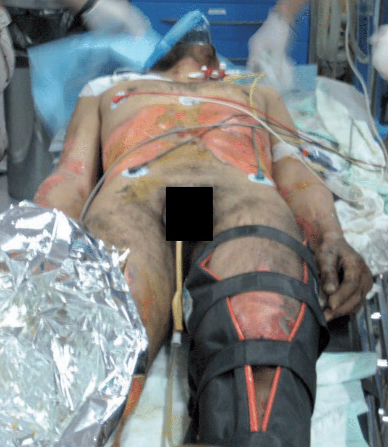 Flash burns, depending on their location, allow us to determine the position of the victim. With regard to toxic asphyxia, there are frequent injuries due to inhalation of: CO, cyanide, and fumigants, as well as inhalation of dust containing asbestos or coal, and of toxic vapours/gases such as Hg, Cl, nitrous, P, and other vapour toxin syndromes.51 which aggravate a concomitant lung blast. Another route of entry is dermal absorption, e.g. P intoxication ("white death") when penetrating the organism after burns by the incandescent flakes of the white phosphorus bomb. Other authors6,22,27,51 also include exacerbation or complications of pre-existing medical conditions and psychological-psychiatric dysfunctions: shell shock, post-traumatic stress disorder (PTSD), and other neuropathologies, e.g. sideration, dissociation, neurosis or suicide.