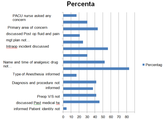 The rest of handover items are communicated with PACU nurse poorly. Those items with very poor practice are chart review 4.3%, contact precaution and allergy 8.7%, past medical hx 37%, patient identification 45%, Staff identification 33.3%, preoperative vital sign 45%, intraoperative position and postop plan 21.8%, Analgesic drug name and timing of administration 34.8%, Duration of anesthesia and surgery 26.1%, informing PACU nurse primary are of concern 30.4%, Post op fluid and pain management plan 26.1%, intraoperative fluid type and infused volume 39.1%, UOP and EBL 34%. This might be related with Absence of preformed patient handover checklist, Lack of easy information accessibility and use of traditional patient handover practice.