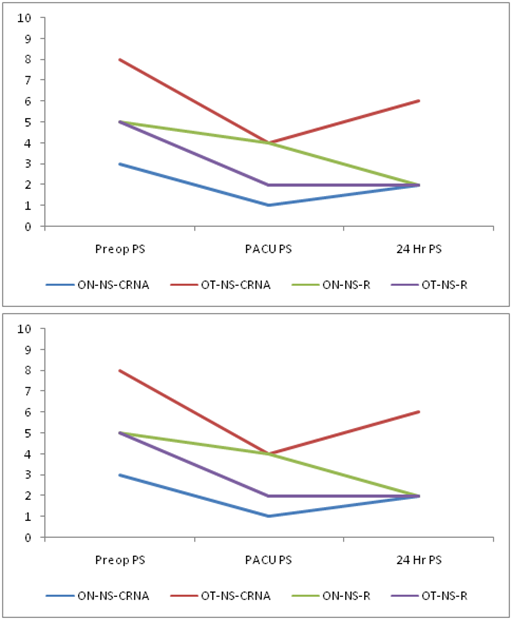 Figure 4 Perioperative mean pain scores (PS) for opioid naïve (ON) and tolerant (OT) patients in the preoperative (Preop), PACU discharge and at 24 hours post sciatic nerve blockade characterized by nerve stimulator (NS) and ultrasound (US) guidance technique and level of practitioner training as either resident trainee (R) or nurse anesthetist (CRNA).