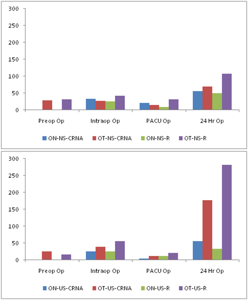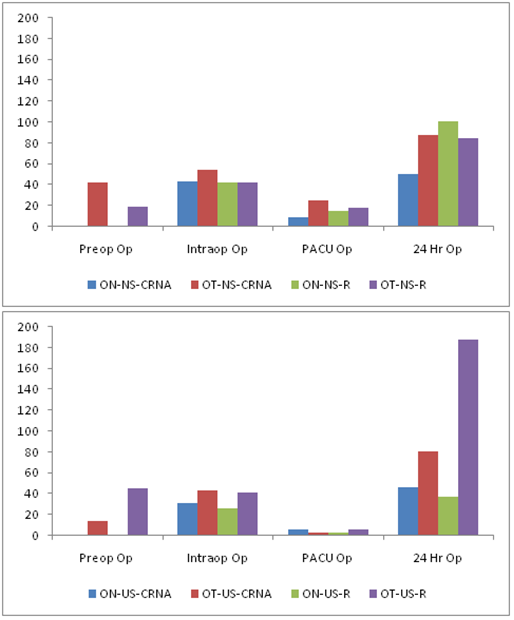 Figure 5 Perioperative opioid dosages expressed as mg equivalents of intravenous morphine sulpahte for opioid naïve (ON) and tolerant (OT) patients in the preoperative (Preop), intraoperative, PACU discharge and at 24 hours post sciatic nerve blockade characterized by nerve stimulator (NS) and ultrasound (US) guidance technique and level of practitioner training as either resident trainee (R) or nurse anesthetist (CRNA).