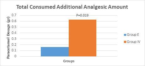 In the postoperative pain treatment of the groups, additional analgesic consumption (paracetamol; 1gr) was used in bolus analgesic management with PCA in cases where VAS>3 was significantly higher in Group IV (0,64±0,81) than Group E (0,16±0,37) (P<0.05) (Figure 2).