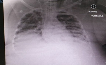 The physical examination of the patient showed that the woman has mild signs of respiratory distress. She had a body temperature of 37.6°C, blood pressure of 112/65 mmHg, pulse rate of 70 bpm, and respiratory rate of 15 bpm. She had oxygen saturation level of 94% on high flow nasal cannula. On the other hand, the laboratory investigations on admissions revealed that the patient had a lymphocyte count of 0.321×103/µL and white blood cell count of 2.50×103/µL. The laboratory test results also showed that the woman had a normal neutrophil count and coagulation profile. The patient had a BUN unit of 1.6 mmol/L, procalcitonin concentration of 0.05 ng/mL, creatinine level of 13 µmol/L, LDH of 338 µL, magnesium ion concentration of 0.73 mmol/L D-dimer concentration of 0.05 mg/L, sodium ion concentration of 135 mmol/L, and ferritin concentration of 310 ng/mL. Furthermore, the result of the venous blood gas analysis indicated the occurrence of metabolic acidosis that is characterized by a pH of 7.28, pCO2 of 63, pO2 76, PFR of 76, and HCO3 of 25. The result of the chest radiograph showed the presence of bilateral lung infiltrates suggesting ARDS (Figure 1).