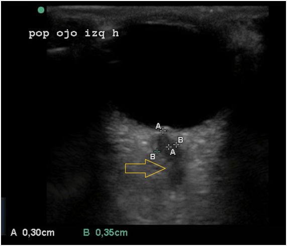 Fifteen minutes after the surgical closing of the eyelid we repeated the assessment of the ONSD and we tried to see the location of the cut in the Optic Nerve Sheath for the eye chosen by the surgeons (Figure 1 & 2). The new measurements were: RE: 70-70 mm and for the LE (the eye chosen for the fenestration): 54-35 mm. The global mean after the surgery was 57,25mm. A decrease in the sheath around the ON could demonstrate the place where the cut was made at the Nerve Sheath (Figure 2).