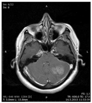 Figure 2 In non-contrast cranial MRI a mass revealed to pressure on the 4th ventricle in the left cerebellum.