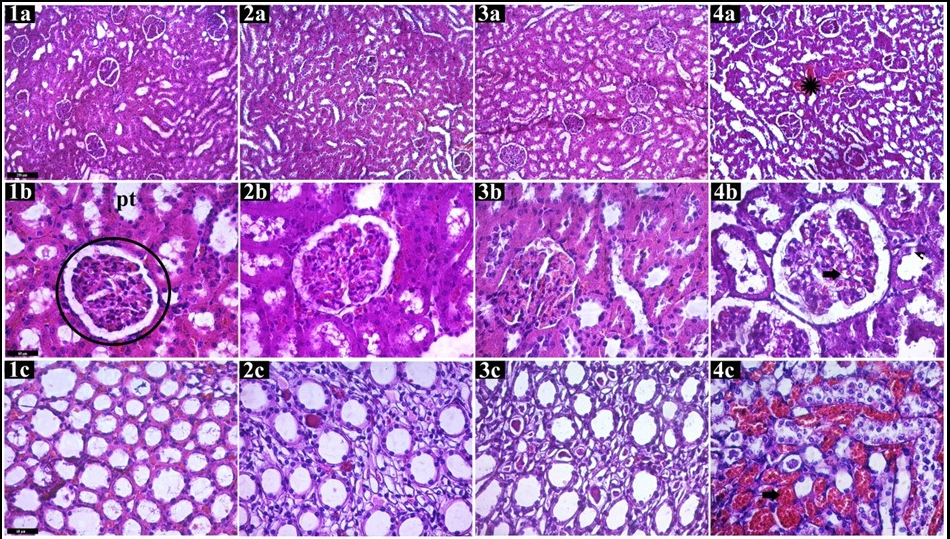 1a, 2a, 3a, 4a. Light microscopy image of the kidney cortex region of group 1, group 2, group 3 and group 4, respectively (x10, Hematoxylin & Eosin staining); 1b, 2b, 3b, 4b. Light microscopy image (x40, Hematoxylin & Eosin staining) in glomerular structures of group 1, group 2, group 3 and group 4, respectively; 1c, 2c, 3c, 4c. Light microscopic image (x40, Hematoxylin & Eosin staining) to the renal medulla region of group 1, group 2, group 3 and group 4, respectively; pt: proximal tubule; Black circle: glomerul; star: vascular congestion; Black thick arrow: vascular dilatation; Black arrow head; degeneration in the tubule.