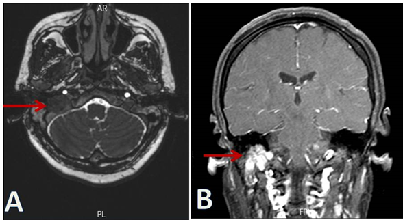 The findings on computerized tomography (CT) scan and magnetic resonance imaging (MRI) suggested a glomus jugulare tumor with destruction of the jugular foramen (Figure 1). CT scan of abdomen showed no evidence of mass lesion and alaboratory tests also showed a normal level of noradrenaline (in plasma and urine) and urinary vanillylmandelic acid (VMA). Seven days prior to surgery, preoperative embolization of tumor vessels was performed. Preoperatively, haemoglobin was 10.8 g/dl. After consultation with a cardiologist and endocrinologist, she was transported to operating room. Prior to induction of anesthesia, standard monitoring including pulse oximeter, ECG and after tracheal intubation End-tidal carbon dioxide (ET CO2) monitors applied. The vital signs were as follows: blood pressure of 132/76 mmHg, heart rate of 92 beats/min with sinus regular rhythm and oxygen saturation (SPO2) was 98 on room air. After placing two large 16-G intravenous catheters and an arterial line in the left radial artery for close haemodynamic monitoring and administration of fluids and vasopressors if needed intraoperatively, midazolam 2 mg and fentanyl 1.5μg/kg were injected. The anesthesia was induced with intravenous propofol 2mg/kg, lignocaine 1 mg/kg and cisatracurium 0.2mg/kg. Anesthesia was maintained uneventfully with isoflurane 0.2%-0.4% in oxygen and fentanyl and cisatracurium. The patient also received propofol (50-75µg/min) and dexmedetomidine (0.1 - 0.15 µg /kg/hour) infusions during surgery. The extracranial and intracranial tumors were resected by an otolaryngologist and neurosurgeon, respectively. Intraoperatively, the patient received one blood unit. In the end of surgery, the neuromuscular blockade was reversed successfully with neostigmine and atropine. When she was fully awake, then, she extubated in the operative room after 13 hours and 40 minutes of surgery. The patient required no hemodynamic support during the procedure. Ultimately, she was transported in a good condition to intensive care unit (ICU). She also had no need of tracheal reintubation or using any inotropes or vasopressors in the ICU and ward.