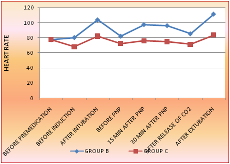 The demographic profile of the patients in two groups is shown in Table 1. Upon statistical comparison of haemodynamic parameters significant variation was observed throughout the intra-operative period. Mean heart rate varied from77.3 ± 10.43 to 111.23 ± 13.67/min in group B and in group C. It varied from 77.66 ± 9.43 to 83.53 ± 8.35/min (P=0.00), Figure 1. Only one patient in group C required inj. Atropine for the treatment of bradycardia HR of 50/min after reversal and needed single dose of inj. Atropine 0.6 mg, who responded promptly. Figure 2 shows mean blood pressure (MBP) record that varied from 91.3 ± 10.05 mmHg before premedication to 104.56 ± 7.31 mmHg after intubation in group B and was higher during PNP. In group C, it varied from 91.4 ± 11.55 mmHg before premedication to 92.46 ± 6.20 mmHg after intubation and was lower as compared to in group B patients during PNP. Changes in both the groups were statistically significant (P=0.00) at all-time except at baseline, where the values were comparable. Table 2 shows intra-operative events. The mean intra-abdominal pressure was around 12 mmHg (P= 0.1127, > 0.05) and duration of PNP was around 53 min (P=0.957, <0.05). 7 (23.33%) patients required intra-operative IV nitroglycerine infusion for control of hypertension in group B whereas no patient required it in group C (P = 0.01, <0.05). The perioperative SpO2 and EtCO2 were within normal range with no statistical significance in variation. The average duration of surgery was 82 minutes. Table 3 displays the various post-operative events. Postoperatively increased number of patients in group C were more sedated (OAS score 2 & 3 = 12), as compared to group B (OAS score 2 & 3= 4).The average VAS score of patients in group B was significantly more 6.56 ± 1.69 as compared to 4.66 ± 1.76 in patients of group C when compared on a 10 point scale. (P= 0.00, < 0.05). The average requirement of injection diclofenac sodium within 24 hrs of patients in group B was 2.33 ± 0.8023 as compared to 1.5 ± 0.6789 in patients of group C (P= 0.0001, <0.05) . Postoperative nausea, vomiting (PONV) occurred in 3 (10%) patients in group B and 2 (6.67%) in group C. (P= 0.50, >0.05). Post-operative shivering occurred in 9 (30%) in group B, where as it 2 (6.67%) in group C (P= 0.02, <0.05) and the difference was statistically significant. The postoperative course was uneventful in all the patients who were discharged on third day and later followed on seventh post-operative day.