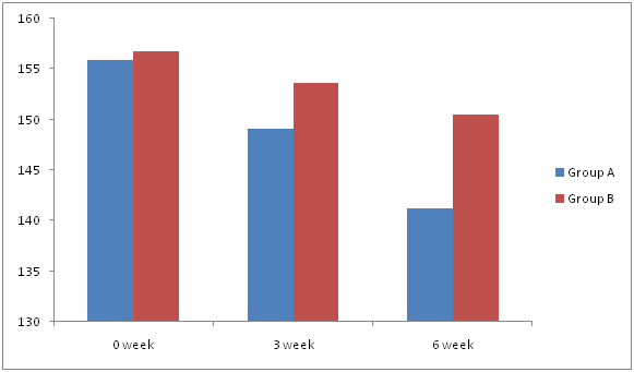 The mean±SD of SBP score for patients in Group A on baseline, 3rd and 6th week was 155.87±8.55, 149.07±8.71 and 141.20±8.41 respectively (Table 1 and Graph 1). Within group analysis revealed that there was highly significant reduction in SBP score in Group A (p<0.001) (Table 1).