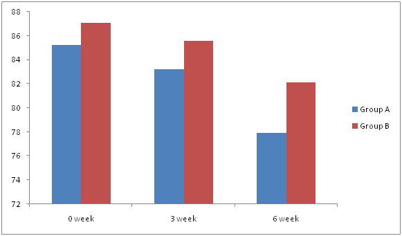 The mean±SD of HR score for patients in Group A on baseline, 3rd and 6th week was 85.26±6.32, 83.20±5.89 and 77.93±4.74 respectively (Table 5 and Graph 3). Within group analysis revealed that there was highly significant reduction in HR score in Group A (p<0.001) (Table 5). The mean±SD of HR score for patients in Group B on baseline, 3rd and 6th week was 87.06±7.11, 85.60±6.64 and 82.13±4.98 respectively (Table 5 and Graph 3). Within group analysis revealed that there was highly significant reduction in HR score in Group B (p <0.001) (Table 5). Between Group analysis showed that a significantly reduction in HR score was observed in Group A at the end of 6th week as compared to that in Group B (p≤ 0.025) (Table 6 and Graph 3).