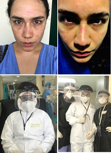 Burnout syndrome is common among doctors from long hours and high pressure situations. This syndrome is serious and can be fatal by promoting high suicide rates among physicians. This situation became even more critical since it diminishes the capacity to provide the best care to patients, favors the possibility of contagion and affects professional training. The COVID-19 pandemic has exerted considerable physical and emotional stress on front-line health workers, with resident and intern doctors being the most affected since they are a special group that has simultaneous tasks of caring for their patients and acquiring new knowledge and technical skills. Being a women, being single and some specialties with greater stress -such as anesthesiology and critical care medicine-, are contributing factors to the development of depression, anxiety, exhaustion and low professional and family productivity.18‒21 Fear, despair, anguish, and fatigue affected the resilience of many trainees, some were not able to overcome so many critical moments and developed burnout syndrome. Figure 1 shows the facial damage in an anesthesia resident moments after a difficult long daytime and overnight shift caring for COVID-19 patients.